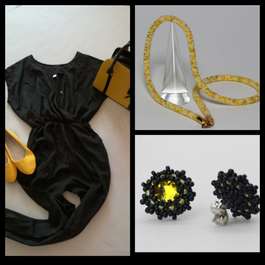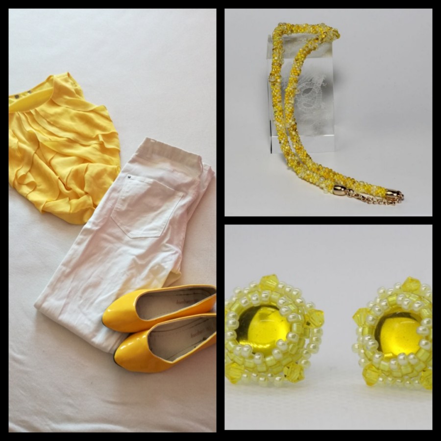 Weiter geht's mit unserem Sommeroutfit. Diesmal gibt es eine Häkelkette aus einem sommerlichen Perlenmix. Dazu ein Paar Ohrringe mit einem wunderschönen gelbem Glasschmuckstein in der Mitte und außen ein bißchen BlingBling. Vielen Dank an sunny_mei84 für die liebevolle Zusammenstellung. Den Schmuck findet Ihr in meinem Dawanda-Shop